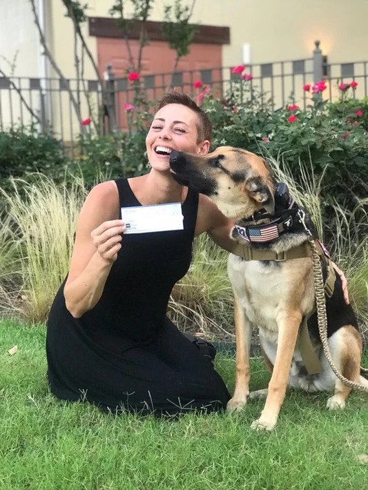 A woman kneels on the grass, holding a check, while a German Shepherd dog licks her face. The dog, adorned with a camouflage harness that has an American flag patch, sits beside her. They are surrounded by bushes and red flowers. Both appear happy.
